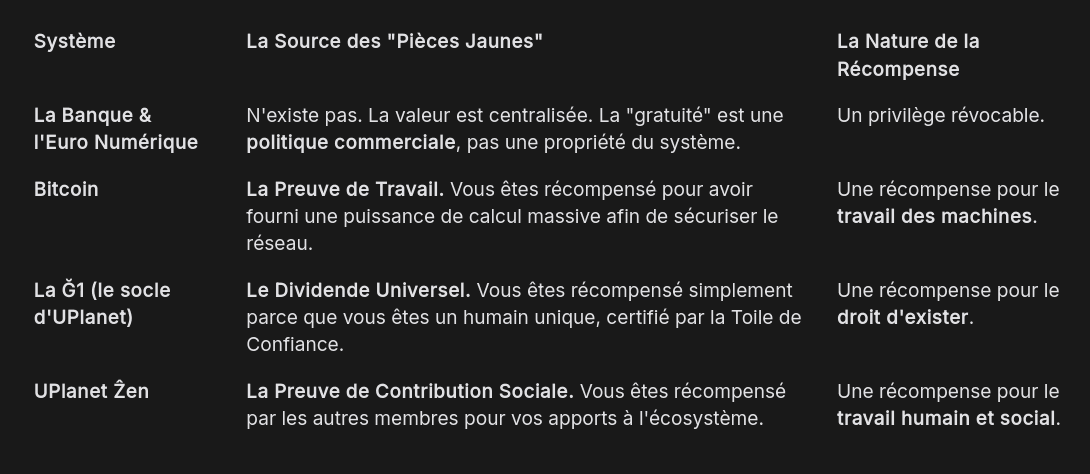 Quand vous postez un message apprécié sur le réseau UPlanet et que vous recevez des “likes” qui sont de véritables micro-paiements en ẐEN, ce sont vos “pièces jaunes”. Elles ne sont pas le fruit du minage, mais le fruit de votre contribution directe à la richesse du commun.